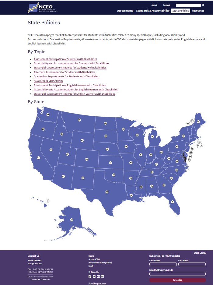 Finding the assessment policies and accommodations manuals for state testing can often feel like a digital scavenger hunt. To simplify this process, NCEO maintains a centralized hub designed to help you quickly locate state assessment policy information. Whether you are looking for specific accommodations for an IEP meeting or researching assessment policies across the country, NCEO’s State Policies Webpage is the place to start.